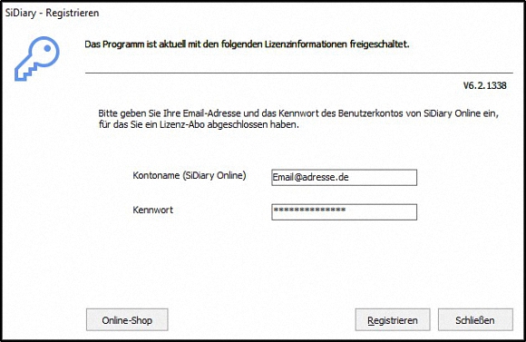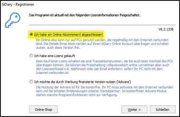 SiDiary PC Version mit Abo-Lizenznr. freischalten