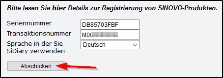 Hier können Sie Ihre Seriennummer und Ihre Transaktionsnummer eintragen; Sie erhalten dann den Lizenzschlüssel automatisch per eMail zugeschickt.