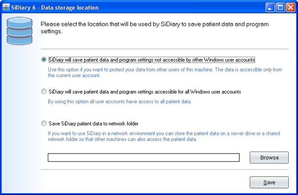 If you use SiDiary in a network and several network clients want to have access to the data, please choose the third option and click on the browse button to find the network file that you want to select.