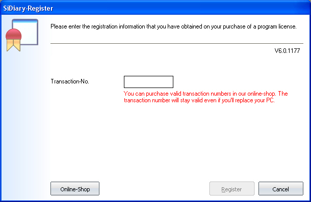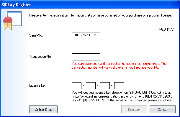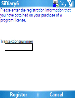 The screenshot above shows you how to unlock SiDiary manual (without internet connection) to get a full version. You need the transaction number that you already received and additionally a licence key, which you can get in the internet from a PC with internet connection at www.sidiary.org/register.asp or by telephone (the phone number is displayed in the program).