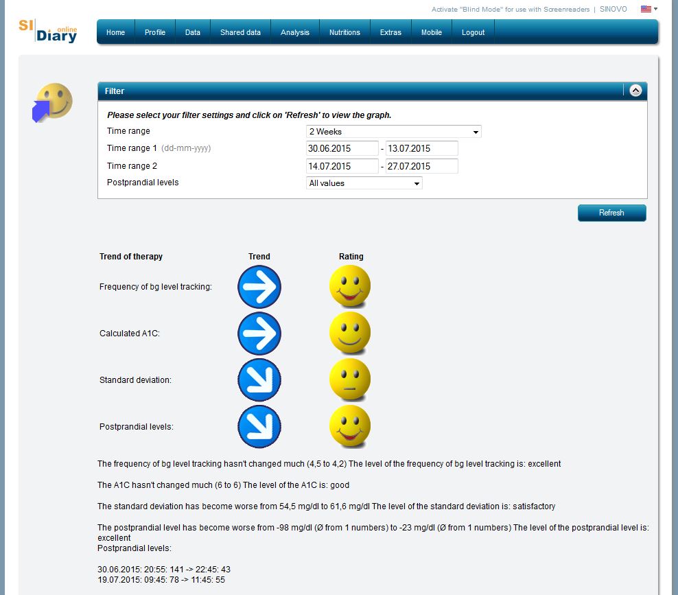 SiDiary Online offers all the features you know from the PC version. You can create an individual user profile regardless of the type of your diabetes (type 1, type 2). Data tracking is pretty easy. Most of the analysis functions you know from the Windows or Smartphone versions are already included in SiDiary Online. Both the popular trend function and the calculated A1c value are available also in SiDiary Online