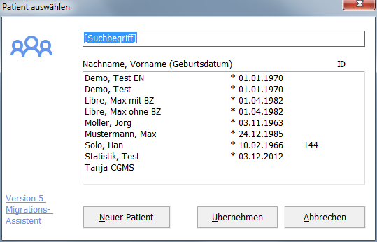 Übrigens: Wenn Sie ein Messgerät auslesen, liest SiDiary auch die Seriennummer des Geräts aus. Ist diese Seriennummer einmal im System erfasst, erkennt das Programm automatisch, welchem Patienten es zugeordnet wurde.