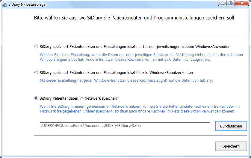 Um SiDiary im Netzwerk zu verwenden, müssen Sie es nur auf jedem Rechner im Netzwerk installieren und mit Ihrer Transaktionsnummer freischalten. Danach können Sie über das Menü 'Werkzeuge ->Dateiablage' ganz einfach einstellen, in welchem freigegebenen Ordner Ihres Netzwerkes die Patientendaten gespeichert werden sollen.